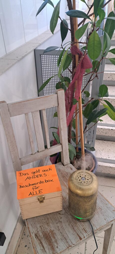 Die Wünsche- oder Beschwerdebox ermöglicht den Kindern ihre Anliegen oder Fragen zu formulieren und positionieren. Gemeinsam, Schulleitung, Schülerinnen und Schüler und Lehrkräfte versuchen einen Konsens zu finden und das Thema vielseitig zu diskutieren.