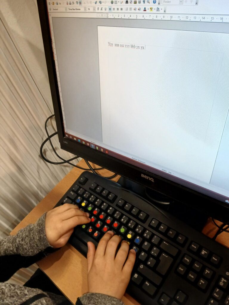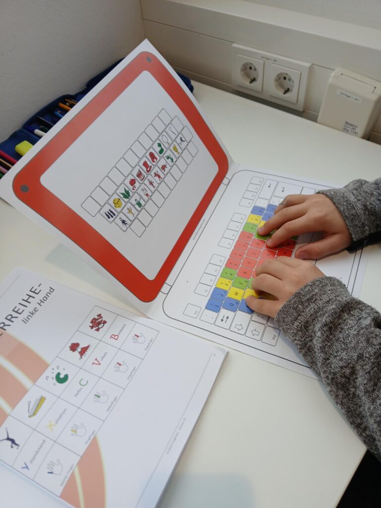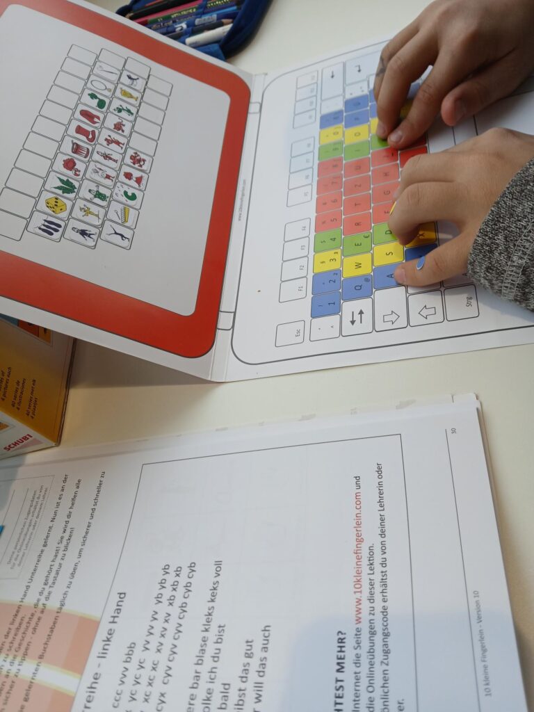 Ergänzend dazu kommt das Zehn-Fingerlein-System am Computer zum Einsatz. Dieses unterstützt Schüler und Schülerinnen beim Erlernen und Festigen der Buchstaben. Gleichzeitig fördert es die Auge-Hand-Koordination. Besonders hilfreich ist dabei die Kombination aus Farben, in eine Geschichte eingebettete Bilder und Buchstaben.