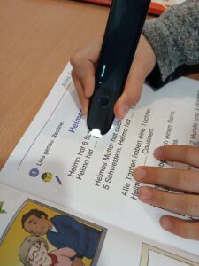Individuelle Fördermaßnahmen für unsere SchülerInnen sind ein zentraler Bestandteil unserer pädagogischen Arbeit. Um die Kinder bei sprachlichen Problemen bestmöglich zu unterstützen, wird ein Pen-Scanner und Lesestift eingesetzt. Dieses Hilfsmittel ermöglicht sowohl Sprachaufnahmen als auch die Umwandlung von gescannten Textzeilen in Sprache. Dadurch wird beispielsweise ein selbstständiges Arbeiten am Wochenplan erleichtert.