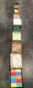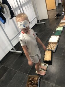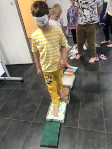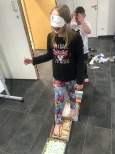 Ein besonderes Erlebnis war unser selbst gestalteter Barfußweg. In verschiedenen Boxen konnten die Kinder mit verbundenen Augen über ganz unterschiedliche Materialien gehen – von Holzklötzen und Holzkugeln über Watte, Paketfüllmaterial, Tannenzapfen bis hin zu Bierkapseln. Mit viel Neugier und Begeisterung ertasteten sie die Untergründe und versuchten zu erraten, was sich jeweils darin verbirgt. Eine tolle Erfahrung, die die Sinne schärft und richtig Spaß gemacht hat!